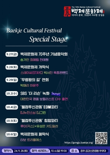 이에 앞서 개막 전날인 27일에는 공주문예회관에서 백제문화제 70주년 기념음악회 ‘백제 위대한 발걸음’ 이 개최된다.