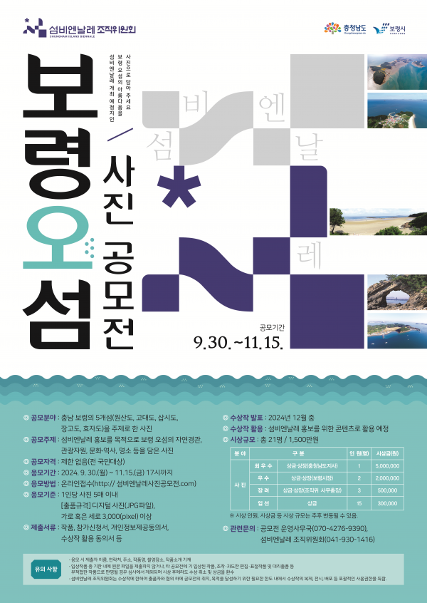 이번 사진 공모전은 섬비엔날레 개최 예정지인 보령의 오섬에 관심 있는 국민 누구나 응모할 수 있으며 오섬의 자연경관, 관광자원, 역사·문화 명소, 나만 알고 있는 숨은 명소 등을 자유롭게 사진에 담으면 된다.