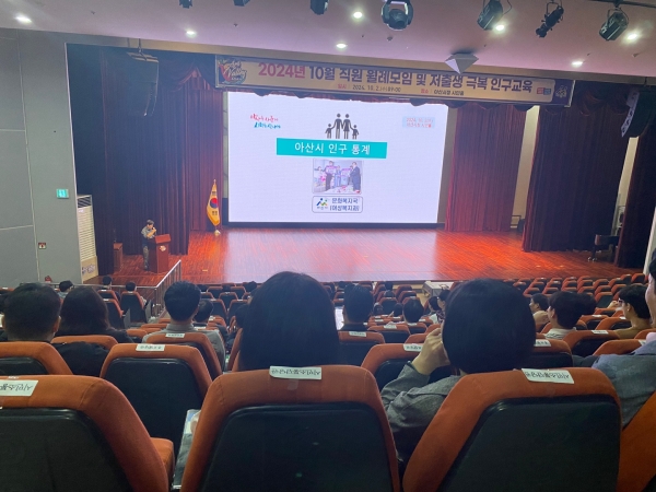 교육은 아산시의 인구통계 현황 및 특징에 대한 설명에 이어 인구와미래정책연구원의 인구교육 전문강사인 구본진 강사가 ‘인구변화의 이해와 미래 준비’라는 주제로 △인구변화에 따른 미래 예측 △인구문제에 따른 인구위기 공감대 형성 및 인식개선 △저출산 고령화 및 지방소멸 대응 전략 등의 내용으로 진행했다.