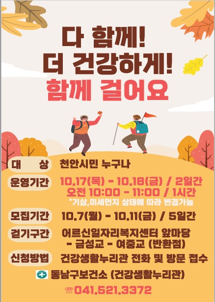 또한, 청수건강생활지원센터는 청수호수공원 일원에서 ‘청수 건강한 걸음’을 10월 25일부터 12월 13일까지 매주 금요일마다 총 8회 운영하며 꾸준한 걷기 운동 습관 형성에 도움을 줄 예정이다.