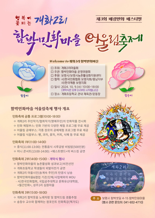 [Ytv영상스토리] 보령시는 오는 9일 10시부터 오후 6시까지 개화초등학교에서 제3회 함박민화마을 어울림축제를 개최한다고 밝혔다.