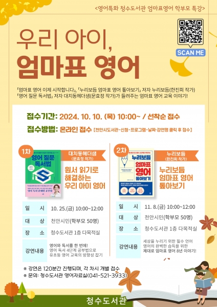 강연은 해당일 오전 10시부터 2시간 동안 청수도서관 1층 다목적실에서 진행되며 자녀의 영어교육에 관심이 있는 학부모를 대상으로 선착순 50명까지 접수받을 예정이다.
