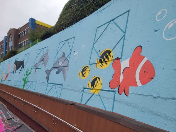 여러 가지 바다 동식물을 주제로 초등학생들의 눈높이를 고려해 오르막길 벽면을 생기있고 아름답게 디자인했다.