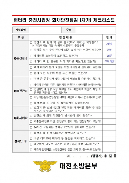 소방본부는 자체 제작한 화재안전점검 체크리스트를 충전사업장에 배부해 충전 환경, 충전관리, 화재 예방, 피난 등 관계자가 상시 화재 예방을 위한 안전점검을 할 수 있도록 지원할 방침이다.