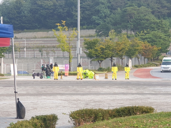 [Ytv영상스토리] 아산시보건소는 지난 8일 이순신종합운동장에서 충남도청 주관, 아산시보건소 주최로 ‘2024년 생물테러 대응 대규모 훈련’을 실시했다.