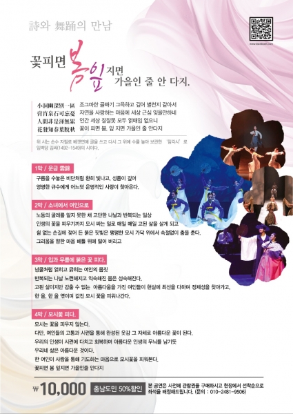 [Ytv영상스토리] 충남을 대표하는 전통예술단 혼의 창작무용 공연인 ‘詩와 舞踊의 만남: 꽃 피면 봄, 잎 지면 가을인 줄 안다지’ 가 오는 25일 다음달 7~8일 21일에 각각 기벌포복합문화센터, 문예의전당, 충남도청 문예회관에서 펼쳐진다.