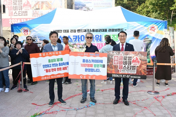 이날 10만명 돌파 기념식에서는 이강권 씨에게 꽃다발과 함께 홍성군 축산단체협의회에서 제공한 홍성 한우·한돈 세트를 기념품을 증정하며 홍성의 멋과 맛을 함께 즐기며 전국 제1의 축산군 홍성으로 미식여행을 다시 와줄 것을 요청했다.