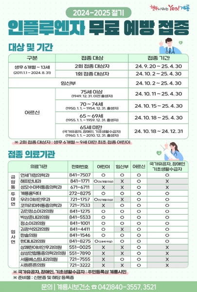 [Ytv영상스토리] 계룡시는 내년 4월 30일까지 겨울철 호흡기 감염병 유행에 대비해 인플루엔자 무료 예방접종을 실시한다고 밝혔다.