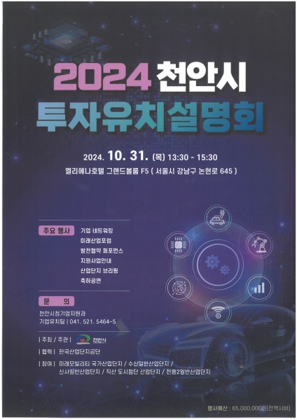 박상돈 천안시장은 “천안은 안정적인 산업 인프라와 전략적 입지, 4차 산업 기반의 첨단 생태계로 매우 매력적인 투자처로 자리 잡고 있다”며 “이번 설명회를 통해 천안의 미래산업 비전을 제시하고 더 많은 기업이 천안의 성장에 동참할 수 있기를 기대한다”고 말했다.
