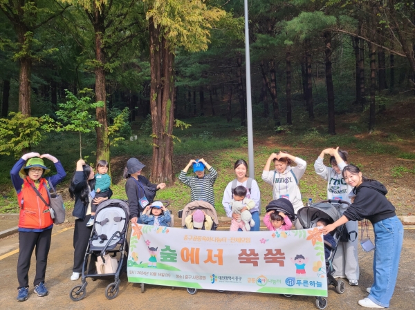 사정공원에서 진행된 이번 행사는 중구 공동육아나눔터에서 품앗이 활동 중인 10가정이 참여해 양육자와 자녀가 함께 듣는 숲 해설을 주제로 △숲 친구를 찾아봐요 △다양한 나무와 친해지기 △생태 놀이 등 숲에 대한 이해와 오감 체험을 통해 숲과 친숙해지는 기회와 함께 품앗이 구성원 간 친밀감을 증대시키기 위해 추진됐다.