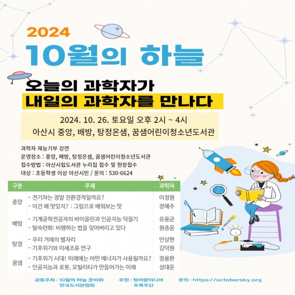 [Ytv영상스토리] 아산시립도서관은 한국도서관협회와 ‘10월의 하늘’ 준비위원회가 공동 주최하는 10월의 하늘 공모사업에 선정되어 오는 26일 오후 2시부터 중앙·배방·탕정온샘·꿈샘어린이청소년도서관 4개 관에서 강연을 개최한다고 밝혔다.