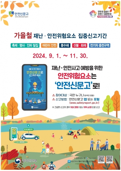이번 집중 신고 기간은 가을철에 자주 발생하는 재난·안전사고를 예방하기 위해 운영한다.