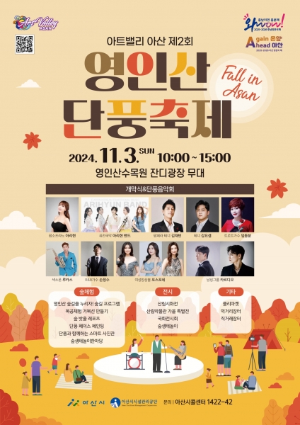 단풍음악회에서는 아산시 홍보대사 강요셉 테너의 오프닝 공연을 시작으로 △팝 소프라노 아리현 △퓨전국악 아리현밴드 △팝페라 테너 김재빈 △트로트가수 임동분 등의 수준 높은 공연이 펼쳐질 예정이다.