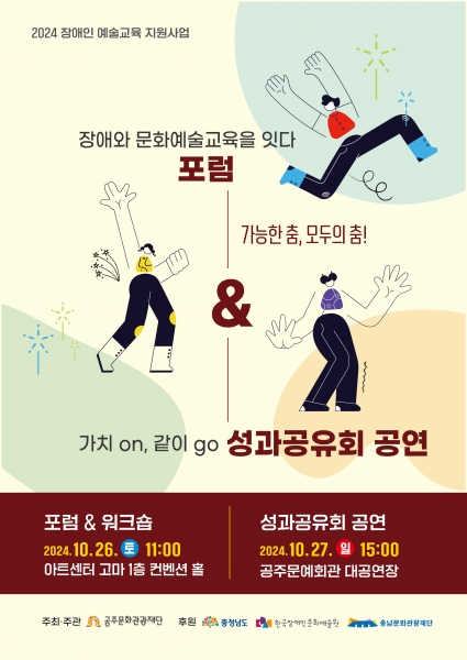 [Ytv영상스토리] 공주문화관광재단은 2024 장애인 예술교육 지원사업 ‘가치 on, 같이 go’ 포럼과 성과공유회 공연을 개최한다고 밝혔다.