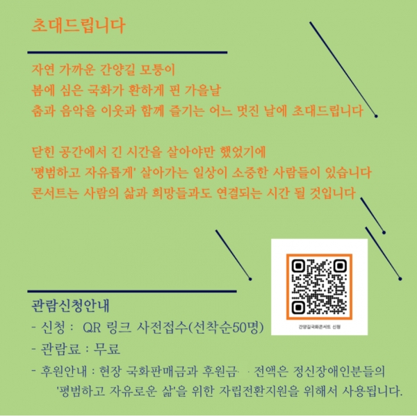 특히 정신장애인의 사회복귀를 응원하는 취지로 올해 처음 추진되는 간양길 국화콘서트는 봄에 시설입소자들이 직접 심고 재배한 국화들이 피어나는 시설 잔디마당에서 열리며 춤과 음악을 이웃과 함께 즐기며 쉴 수 있는 따뜻한 시간이 될 전망이다.