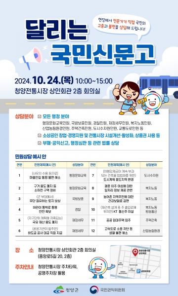 [Ytv영상스토리] 청양군은 오는 24일 청양 전통시장 상인회관 2층에서 국민권익위원회 주관 2024년 맞춤형 ‘달리는 국민신문고’를 운영한다.