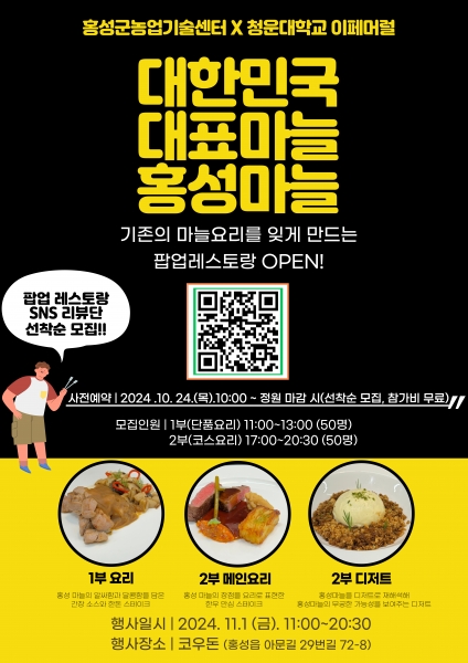 청운대학교 호텔조리식당경영학과 창업동아리 ‘이페머럴팀’과 함께하는 ‘홍성마늘 팝업 레스토랑’ 이 11월 1일 코우돈 상가에서 진행된다.