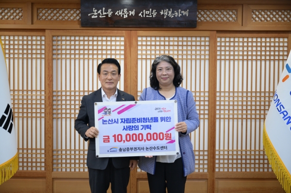 이번 기부는 공기업으로서 사회적 책임을 다하고 관내 자립준비청년들의 자립을 돕고자 마련됐으며 백성현 논산시장과 K-Water 충남중부권지사 심은수 지사장, 이화숙 논산수도센터장이 함께 자리했다.