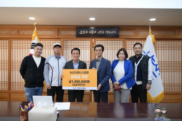 이준호 논산시테니스협회회장은 “논산시 미래인재 양성과 지역 교육 발전에 보탬이 되었으면 좋겠다는 회원들의 의견을 모아 기탁했다”며“미래를 이끌어 갈 인재들이 학업을 포기하지 않고 꿈과 희망을 향해 전진할 수 있도록 도움이 되길 바란다”고 전했다.
