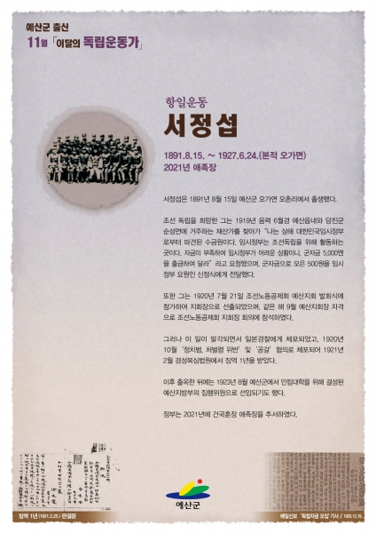 오가면 오촌리 출생인 서정섭 선생은 3.1운동 직후 임시정부를 지원하기 위해 충남지역 독립운동자금 모집활동을 전개했다.