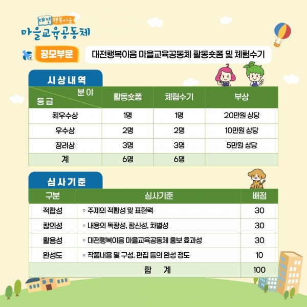 이번 공모전은 대전행복이음 마을교육공동체의 다채로운 활동을 소개하고 교육가치를 확산하기 위해 대전광역시 각급학교와 기관의 학생과 교원을 대상으로 실시한다.