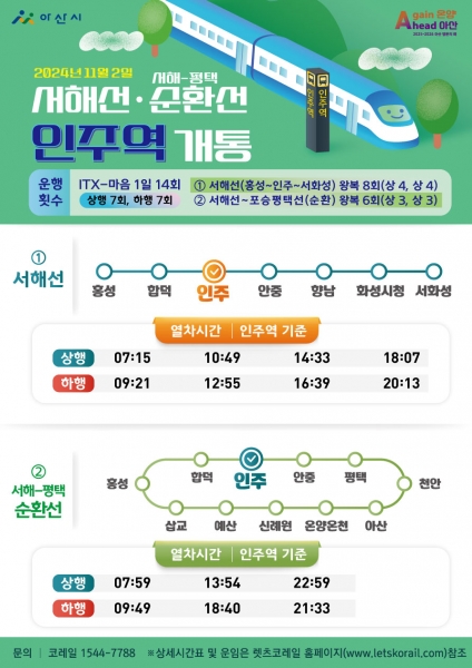 한편 인주역 열차 승차권은 역사 내 무인발급기나 창구, 코레일 홈페이지, 전용 어플리케이션 등에서 예매할 수 있다.