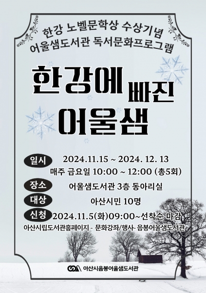 이번 독서프로그램 신청은 11월 5일부터 아산시립도서관 누리집을 통해 선착순으로 진행되며 기타 자세한 사항은 음봉어울샘도서관으로 문의하면 된다.