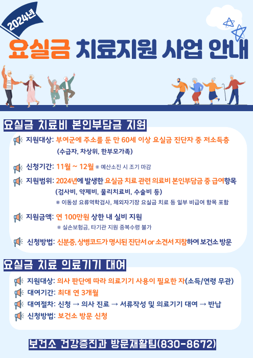 [Ytv영상스토리] 부여군은 올 연말까지 부여군에 주소를 둔 만 60세 이상 저소득층 부여군민을 대상으로 요실금 치료에 따른 의료비 본인부담금을 연 100만원 범위에서 지원한다.
