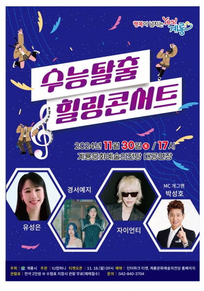 [Ytv영상스토리] 계룡시가 오는 30일 계룡문화예술의전당에서 수능을 마친 수험생들을 위해 ‘수능 탈출 힐링 콘서트’를 개최한다고 밝혔다.