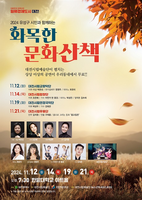 이번 공연은 지난 4월 대덕구, 6월 동구, 10월 중구에 이어 올해 마지막 공연으로 한밭대학교로 찾아가 시민들에게 삶의 기쁨과 여유를 선사할 것이다.