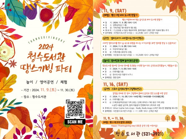 한편 오는 9일부터 30일까지 청수도서관 1층 로비에 ‘땡스기빙데이’분위기를 느낄 수 있는 포토존이 조성 될 예정이다.