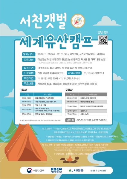 캠프는 오는 11월 30일부터 12월 1일까지 서천갯벌 일원에서 운영되며 참여자들은 갯벌생물 관찰 및 탐조, 지역특산물 체험, 해양정화활동 등의 활동을 하게 된다.