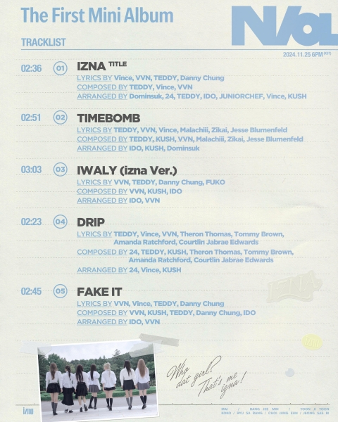 공개된 트랙리스트에 따르면 이번 미니 1집에는 타이틀곡 ‘IZNA’를 비롯해 ‘TIMEBOMB’, ‘IWALY ’ 그리고 ‘DRIP’, ‘FAKE IT’까지 총 다섯 개의 트랙이 수록된다.