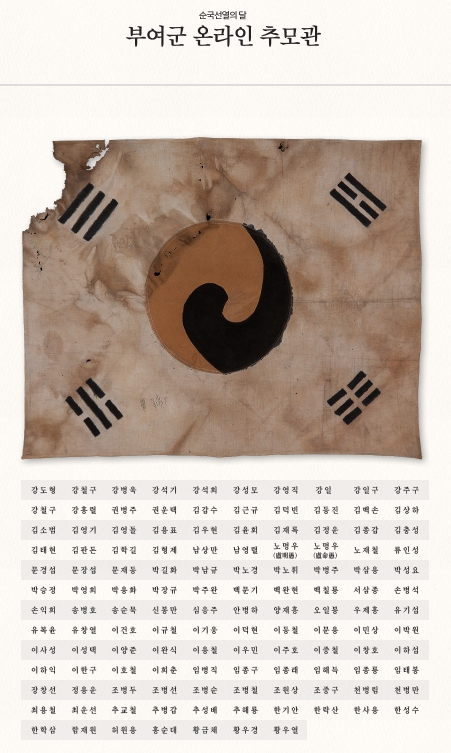 부여군 관계자는 “순국선열의 날을 맞이해 그분들의 헌신에 감사와 존경을 표하는 온라인 헌화에 많은 군민이 동참해 줄 것”을 당부했다.