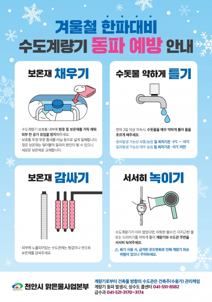 수도시설의 동파·결빙 등 피해 발생 시 천안시 맑은물사업본부 급수과 누수방지팀 또는 상수도 콜센터로 신고하면 신속하게 부품을 교체 받을 수 있다.