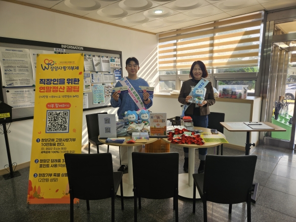 기부에 참여한 직원 A씨는 “연말정산 혜택뿐 아니라 다양한 홍보 물품까지 추가로 받게 되어 기쁘다”며 “내년에도 청양군 고향사랑기부제에 참여 하겠다”고 전했다.