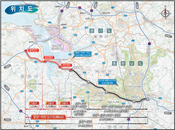 당진~아산 고속도로는 2004년 당진~천안 고속도로에 대한 예비타당성조사가 완료된 이후 2009년 단계별 건설계획에 따라 염치~천안 구간이 2023년 9월 개통했으며 인주~염치 구간은 2026년 준공 예정이다.