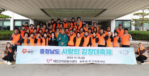 행사 참여를 위해 각 읍·면에서 모인 태안군 자원봉사자들은 김치 담그기와 재료 보충, 배달 등 각자의 역할을 충실히 수행해 호평을 받았으며 이들이 담근 김치는 15개 시·군의 장애인 가구, 한부모 가정, 독거노인 등 소외계층에 분배될 예정이다.
