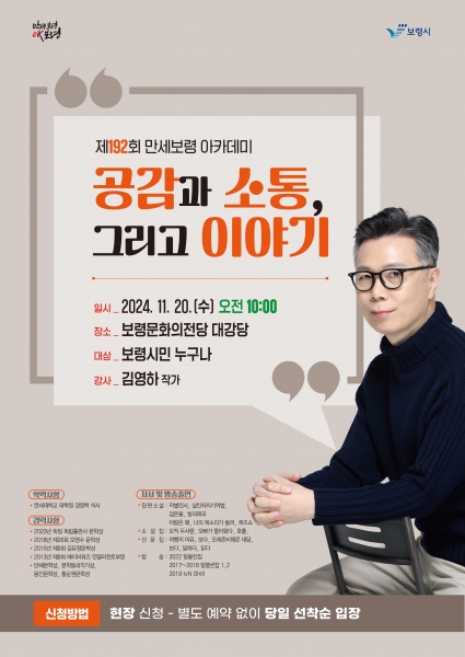 [Ytv영상스토리] 보령시는 오는 20일 오전 10시 보령문화의전당 대강당에서 작가 김영하를 초청해 ‘공감과 소통, 그리고 이야기’라는 주제로 제192회 만세보령 아카데미를 개최한다.