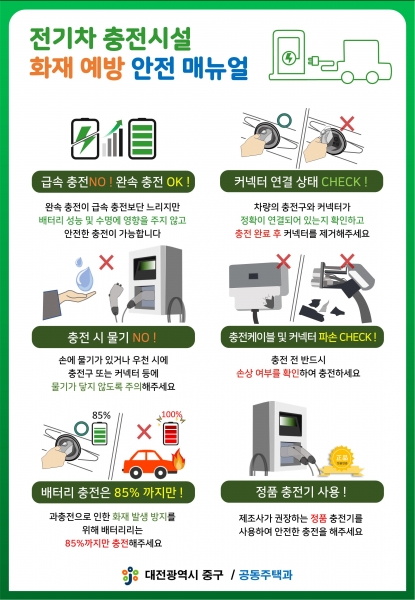 김제선 중구청장은 “전기차 충전시설 화재예방 정책을 적극 추진해 구민의 불안감을 해소하고 소중한 생명과 자산을 보호할 수 있도록 최선의 노력을 다하겠다”며“전기차주와 시설관리자분들도 화재예방 안전수칙을 숙지하시어 화재예방을 위해 반드시 실천해 주시길 바란다”고 당부했다.