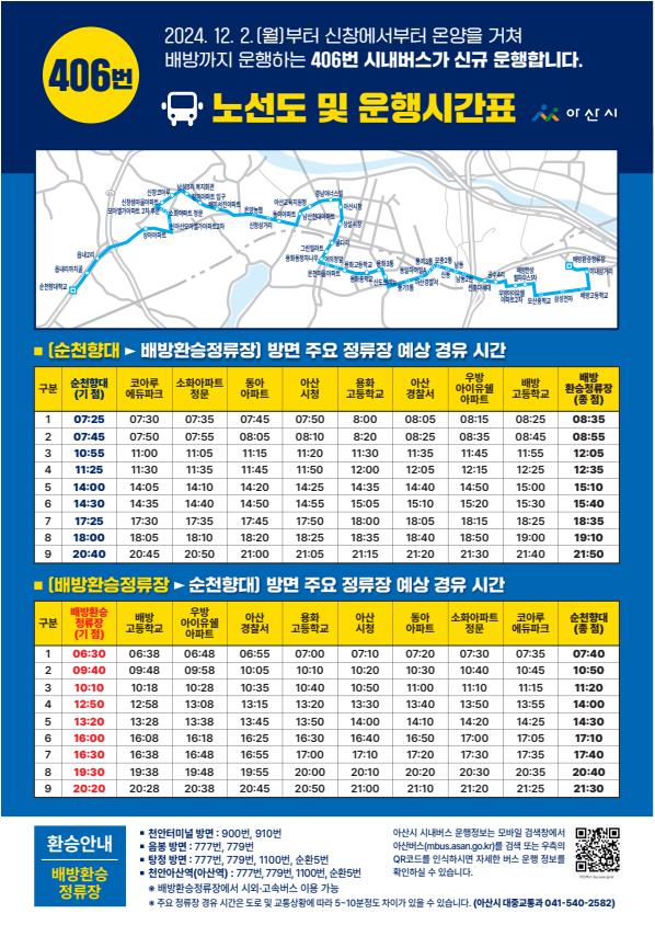 이번에 신설되는 406번 노선은 신창에서 배방까지 한번에 이동이 가능한 신규 노선으로 순천향대학교와 배방환승정류장을 기·종점으로 1일 왕복 9회 운행한다.
