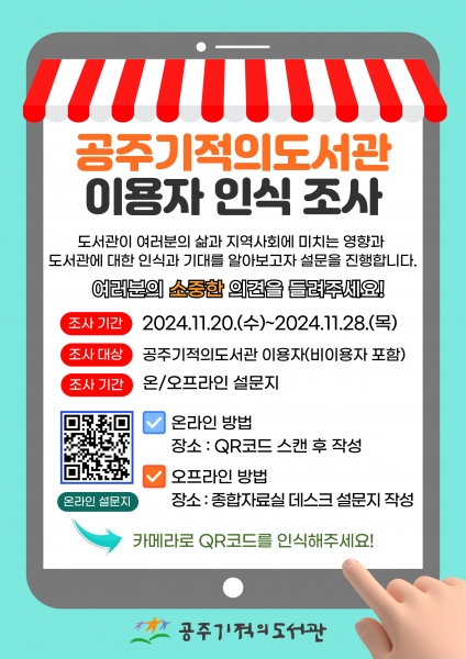 조사는 네이버폼을 통한 온라인 설문과 도서관 로비 및 종합자료실에서 오프라인 설문 방식으로 병행 실시된다.