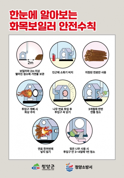 안전수칙에는 △보일러와 2m이상 떨어진 장소에 가연물 보관 △인근에 소화기 비치 △지정된 연료만 사용 △투입구 개폐시 화상 주의 △나무연료 투입 후 투입구 꼭 닫기 △3개월에 한 번 연통 청소 △연료 한꺼번에 넣지 않기 △젖은 나무 사용 시 투입구 안 3~4일에 1번 청소 등 내용이 담겼다.