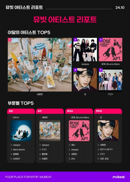 3위에는 전 세계에 ‘아파트 열풍’을 이끈 로제와 브루노 마스가 압도적인 동영상 점수를 가져가며 이름을 올렸고 ‘뮤빗 K-POP 팬투표’에서 가장 많은 득표수를 얻은 방탄소년단 진이 4위, 그룹 있지가 5위에 차례로 랭크됐다.