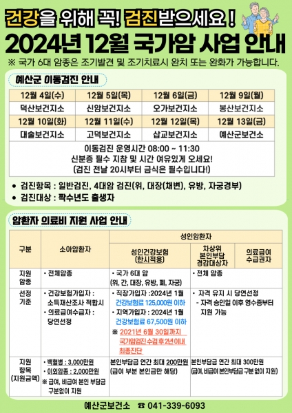 [Ytv영상스토리] 예산군보건소는 인구보건복지협회 대전충남지회와 함께 국내 사망원인 1위인 암 조기 발견 및 의료비 절감과 군민 건강 향상을 위해 ‘찾아가는 국가 암 이동검진’을 12월 4일부터 13일까지 실시한다.