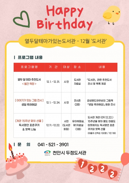 또한, 두정도서관 개관 15주년을 맞이해 도서관 대출자 100명에게 몸과 마음이 따뜻해지는 독서명언 포춘쿠키, 핫팩 등 선물을 증정하는 행사를 오는 11일부터 22일까지 운영할 예정이다.