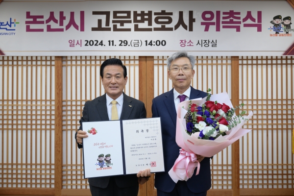 백성현 논산시장은 “풍부한 경험과 뛰어난 법률적 역량을 갖춘 이승훈 변호사님을 고문변호사로 위촉하게 되어 매우 뜻깊다”며 “이번 위촉이 논산시 행정의 투명성과 신뢰성을 강화하는 계기가 되길 바란다”고 말했다.
