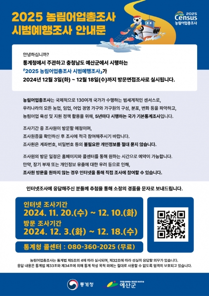 [Ytv영상스토리] 예산군은 12월 3일부터 18일까지 16일간 2025 농림어업총조사 시범 예행 조사를 실시한다.