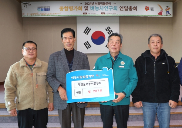 군에 따르면, 태안군벼농사연구회 신양우 회장과 김천중 부회장, 은창기 총무, 김재환·이용안 감사 등 5명은 지난 3일 태안군농업기술센터 대강당에서 가세로 군수 등이 참석한 가운데 기탁식을 갖고 어려운 이웃에 도움을 주고 싶다며 10kg 쌀 287포를 군에 기탁했다.
