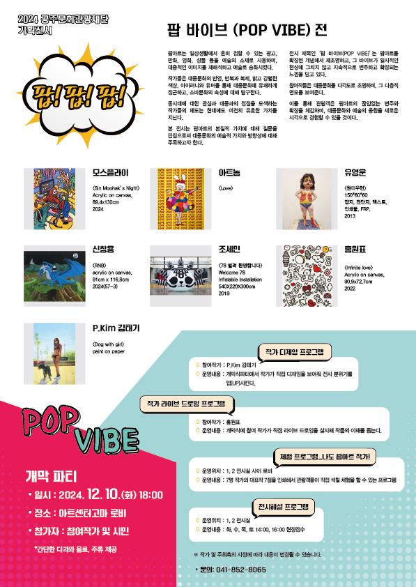 [Ytv영상스토리] 공주문화관광재단은 시민들에게 수준 높고 새로운 전시를 제공하기 위해 2024 기획전으로‘팝 바이브’를 오는 12월 10일부터 명년 1월 19일까지 아트센터고마에서 개최한다.